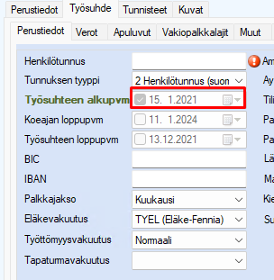 Tarkista, että henkilöllä on Henkilörekisterissä määritetty työsuhteen alkamispäivämäärä: