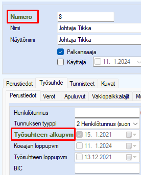 Sitten klikkaa vihreää Numero -sanaa tai vihreää Työsuhteen alkupvm -kohtaa niin tilannekohtainen valikko aukeaa:
