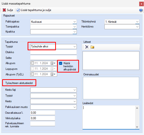 Käytä henkilön alkupäivää –optiolla voit lisätä rajauksiin määritellyille henkilöille työsuhde alkoi –tyyppisen tapahtuman, jolloin alkupäivämäärä haetaan henkilön perustiedoista henkilörekisteristä. Optio on käytössä siis ainoastaan tapahtumatyypillä Työsuhde alkoi. Lisääthän myös Työsuhteen aloitustiedot samalla: