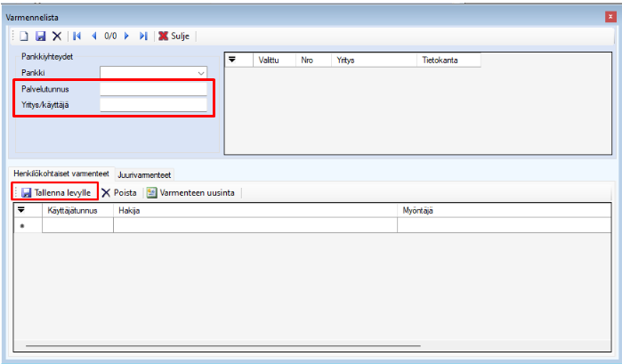 - Tallenna pankkivarmenteet levylle ja ota talteen varmenteen tiedoista Palvelutunnus ja Yritys/käyttäjä -tiedot. Pankkivarmenteet saat tallennettua kohdasta Pankkiyhteys | Varmennelista | Valitse varmenne -> Tallenna levylle. Tallentamisen yhteydessä ohjelma kysyy salasanaa ja sen voitte määrittää itse. Salasanaa tarvitaan kun päivityksen jälkeen pankkivarmenteet tuodaan uudelleen ohjelmaan pankkisopimuksiksi. Varmenteet on hyvä tallentaa esim. L-asemalle/levyjakoon, laita muistiin mihin varmenteet on tallennettu. Muista tallentaa kaikki listalla olevat varmenteet. Mikäli listalla on vanhentuneita varmenteita (voimassaolo vanhentunut) tai tuplana sama varmenne samalla palvelutunnuksella, tulisi nämä poistaa listalta.
