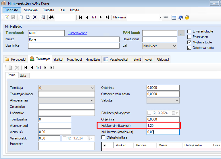 Kulukertoimen voi lisätä nimikkeen tietoihin Toimittajat -välilehdelle ko. toimittajan Kulukerroin (tilaukset) -kenttään.