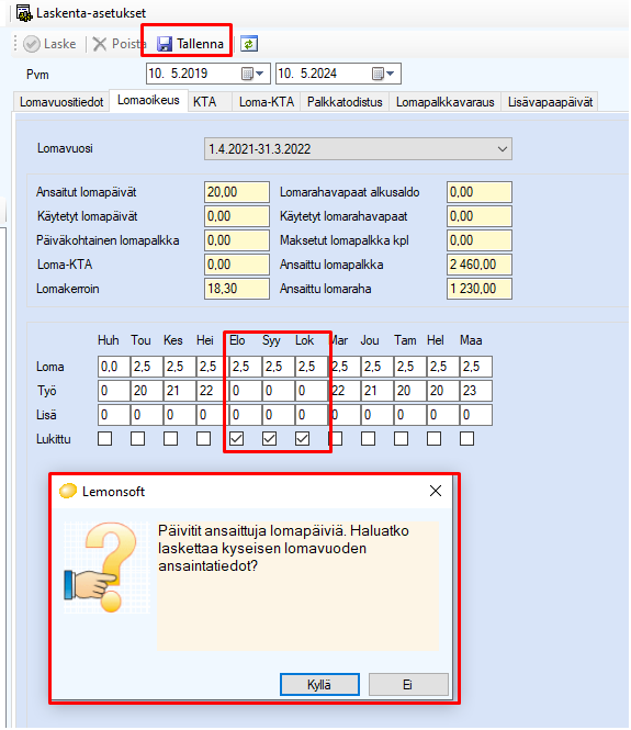 Mikäli lisäät lomapäiviä kuukausille manuaalisesti, lukitse rivi ennen tallennusta. Ohjelma kysyy tallennuksen yhteydessä haluatko laskettaa kyseisen lomavuoden ansaintatiedot. Mikäli vastaat Kyllä, ohjelma laskee ansaitun lomapalkan ja lomarahan uudelleen ottaen huomioon manuaalisesti lisätyt lomapäivät.