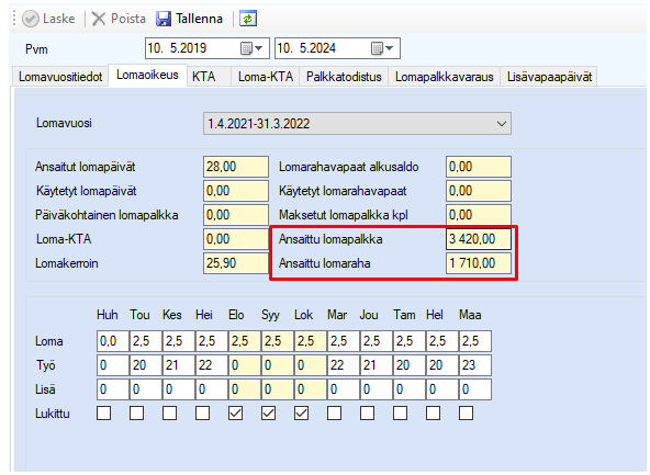 Taulukon alaosassa näkyy ohjelman laskemat lomapäivät kuukausitasolla. Loma-kenttiin voit muokata/lisätä manuaalisesti lomapäiviä esimerkiksi kuukausilta, joista kertyy lomaa, mutta palkansaajalle ei makseta varsinaista palkkaa.