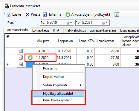 Voit hyväksyä alkusaldot suoraan lomavuosiriviltä hiiren oikealla valinnalla Hyväksy alkusaldot. Samalla tavalla voit myös perua hyväksynnän valinnalla Peru hyväksyntä.