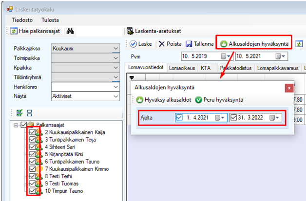Avainsanat: lomalaskenta, alkusaldot, hyväksyntä, lukitus
