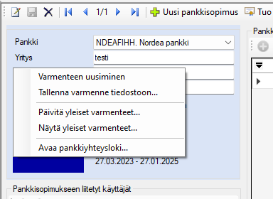 Pankkisopimuksissa yleiset varmenteet pääsee päivittämään Taloushallinto/Pankkiyhteys/Pankkisopimukset/Käyttäjätunnus toiminnon kautta.