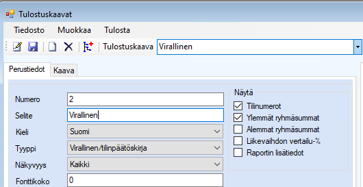 Tulostuskaavoja hallitaan valikossa: Asetukset | Tulostuskaavat. Valitkaa Tulostuskaava-alasvetovalikosta kaava, jota käytätte tilinpäätöksiin -> Tarkistakaa, että Tyyppi-valikossa on valintana 1. Virallinen/tilinpäätöskirja. Jos siinä on jokin muu valinta niin muokkaus-tilassa voitte muuttaa valintaa.