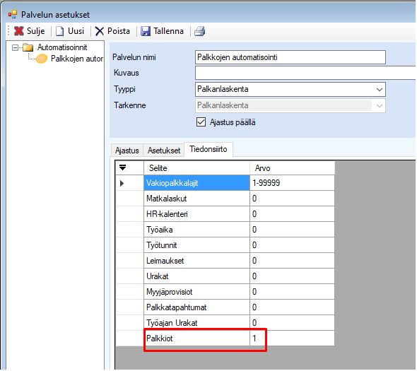 Voit myös automatisoida palkkioiden siirron palkanlaskentaan määrittelemällä automatisoinnin palvelun asetuksiin palkkiot tuotavaksi (arvolla 1). Voit lukea palkanlaskennan automatisoinnista tarkemmin ohjeesta Palkanlaskennan automatisointi.