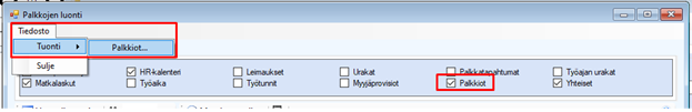 Voit tuoda euromääräiset palkkiot suoraan palkoille csv-tiedostosta Palkkojen luonti -näytön Tuonti-valikosta. Valitse myös Aineistot-välilehdeltä Palkkiot aktiiviseksi.