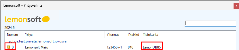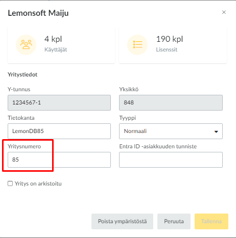 Yritykselle voi ottaa käyttöön yritysnumeroksi Tietokannan numeron, eli tässä esimerkissä numeron 85, joka näkyy oikealla puolella Tietokanta -otsikon alla LemonDB85 -kohdassa.