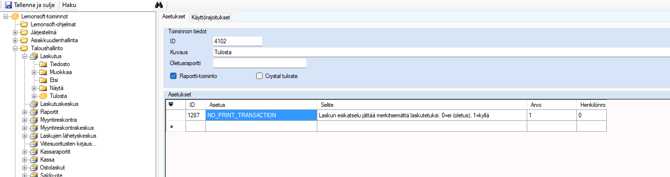 avainsanat: lasku, esikatselu, laskutettu, toimintokeskus, NO_PRINT_TRANSACTION