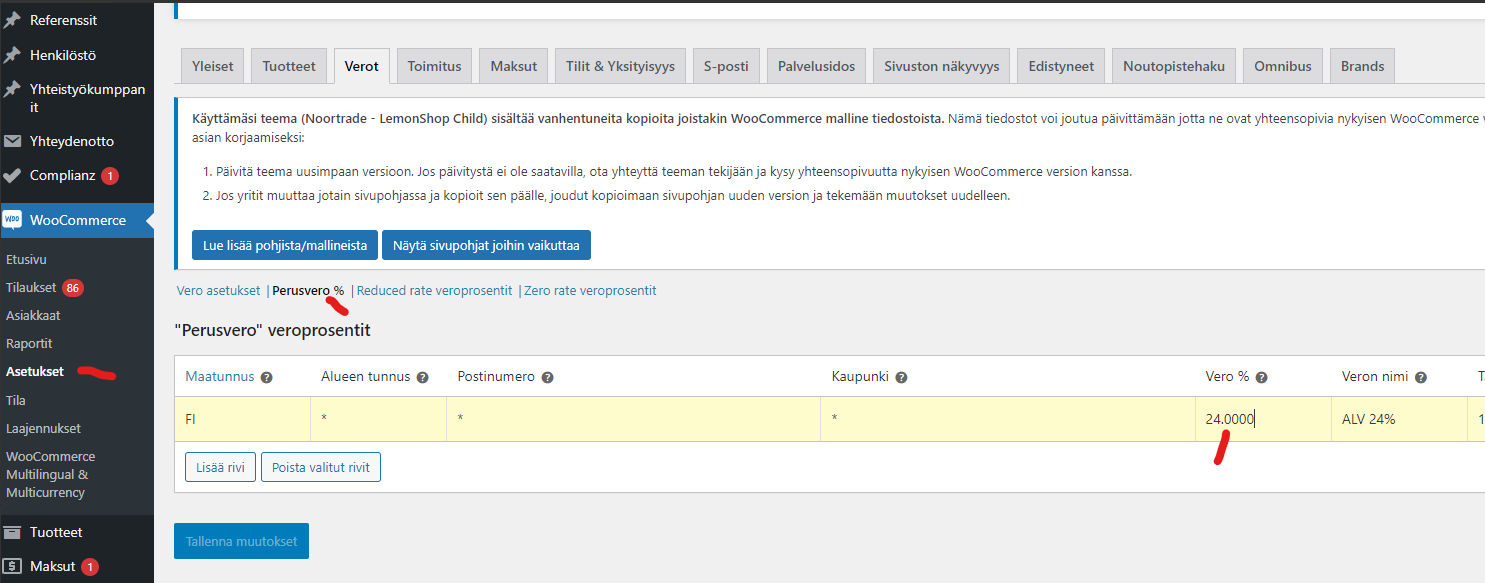 Verkkokaupassa WooCommercessa käy muuttamassa ALV-verokannat alla olevasta kohdasta. Huom. muutos tulee voimaan HETI, joten tee muutos vasta 1.9.2024.