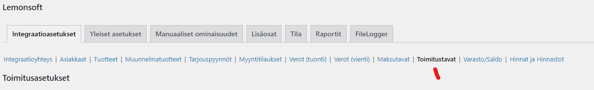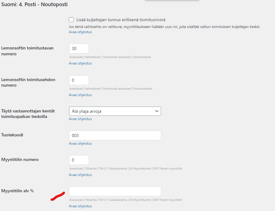 Tarkista lisäksi onko yritykselläsi asetettuna Lemonsoft -integraatiolisäosassa toimitustavoille ALV-prosenttia alla kuvassa merkityssä kohdassa (per toimitustapa). Jos kenttä on tyhjä, tähän ei tarvitse kirjoittaa mitään, mutta mikäli tässä on ALV-prosentti, niin muuta myös oikea prosentti tähän.