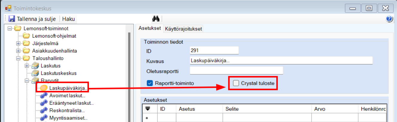Avaa Järjestelmä | Toimintokeskus -näyttö ja poraudu kuvan mukaisesti Taloushallinto | Raportit -valikkoon. Valitse Laskupäiväkirja aktiiviseksi ja poista Crystal-tuloste -kohdasta rasti ja Tallenna ja sulje. Tämän jälkeen, kun avaat ohjelmasta Taloushallinto | Raportit –valikosta Laskupäiväkirja-tulosteen, tulostuu raportti dynaamisena raporttina.