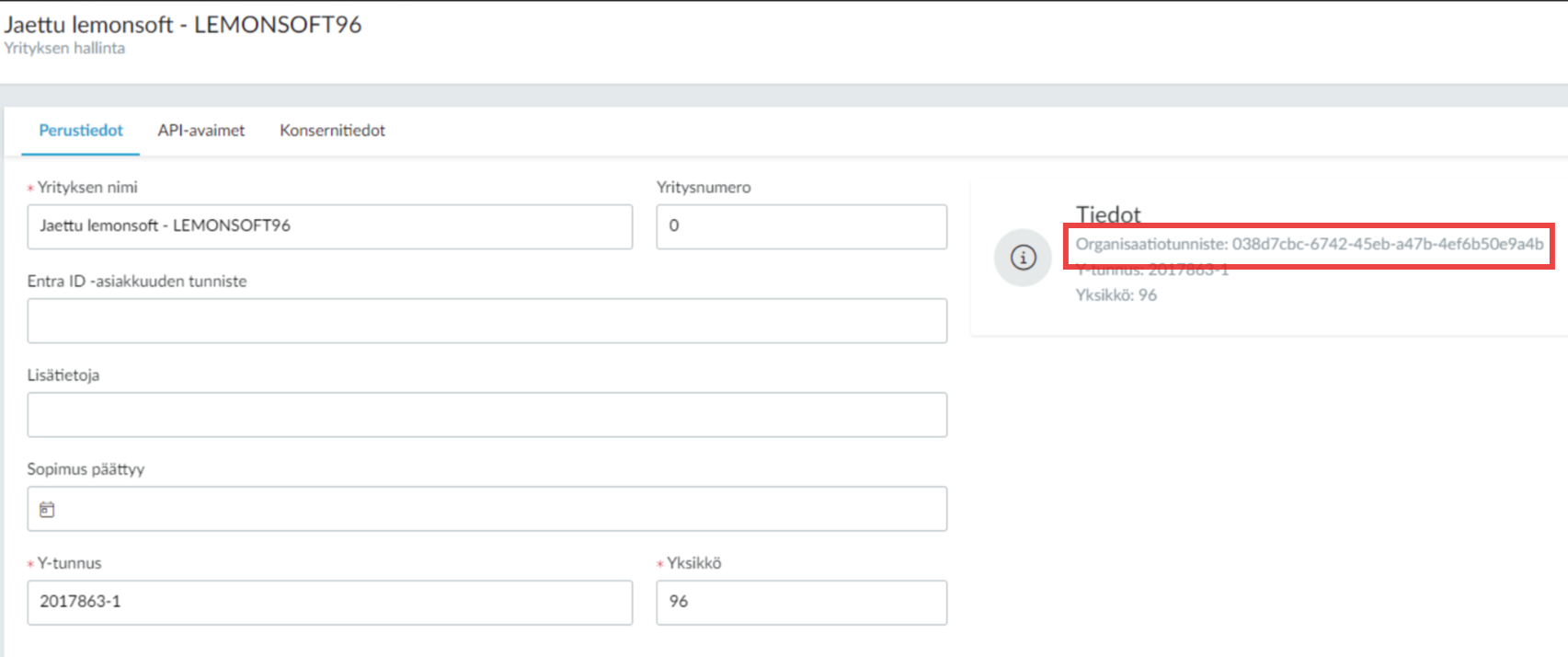 Toinen muutos liittyy kirjautumiseen. Kirjautumisessa on tähänkin saakka käytetty parametria ”database”. Parametrin merkitys muuttuu ja se tarkoittaa yrityksen organisaatiotunnistetta. Organisaatiotunnisteen löydät käyttäjähallinnasta yrityksen tiedoista otsikolla ”Organisaatiotunniste” (katso kuva alla).