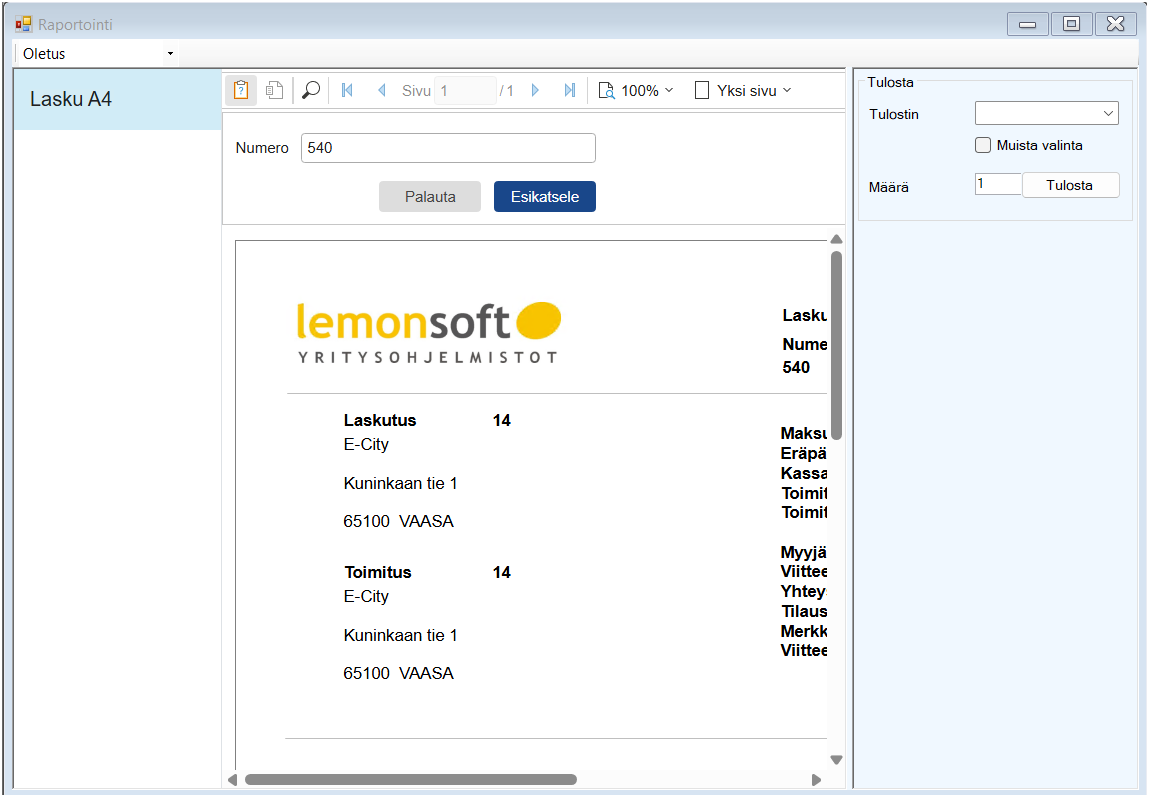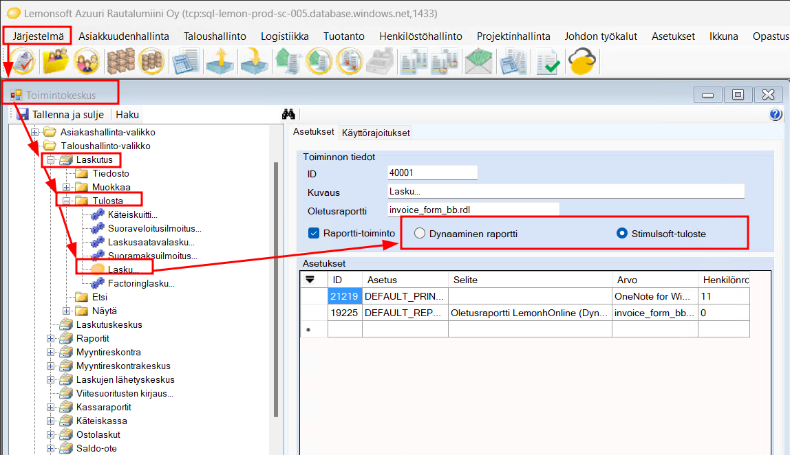 Esimerkki: Laskun tulosteessa voit valita, tulostuuko raportti Stimulsoftilla vai SSRS:llä.