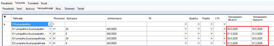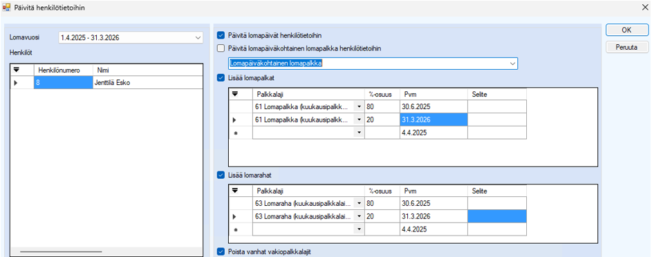 Tarvittaessa voitte päivittää sekä lomapalkat että -rahat henkilön vakiopalkkalajeihin, josta ne muodostuvat palkanlaskentaan. Tarvittaessa voi vakiopalkkalajeihin päivityksen tehdä myöhemmin.