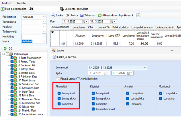 Lomavuositietojen laskenta tapahtuu Lomavuositiedot-välilehdellä Laske-toiminnolla, tutustu Lomavuositietojen ohjeeseen lomalaskenta. Huomioithan alkusaldojen valinnan, jolloin edellisen lomanmääräytymisvuoden jäljellä sekä ansaitut lomat muodostavat alkusaldon 1.4.2025. Huomioikaa tarvittaessa myös Loma-KTAn päivitys henkilötietoihin.