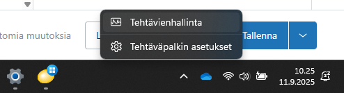 Avaa Tehtävienhallinta esimerkiksi klikkaamalla tehtäväpalkkia hiiren oikealla ja valitsemalla Tehtävienhallinta.