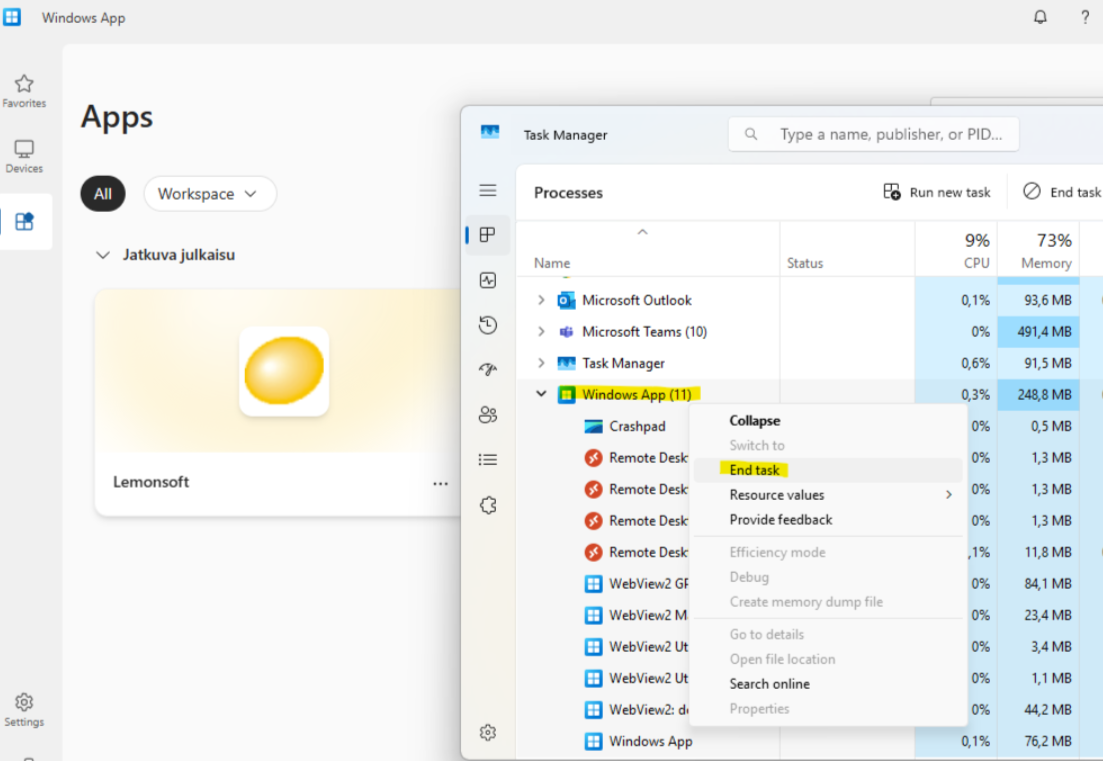 Tarkista Tehtävienhallinnasta, ettei Windows App -prosessi ole enää käynnissä (ks. kohta 6 alempana).