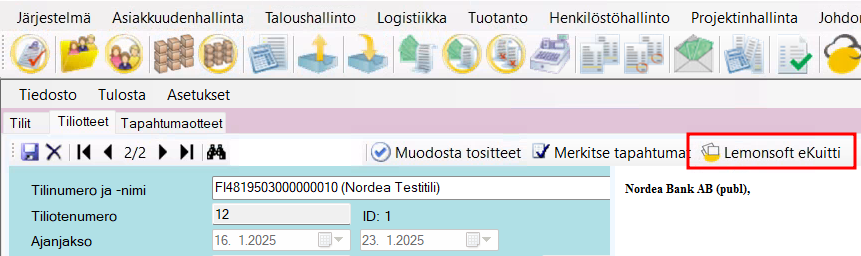 Tiliotenäkymässä on käytettävissä Lemonsoft eKuitti -toiminto.