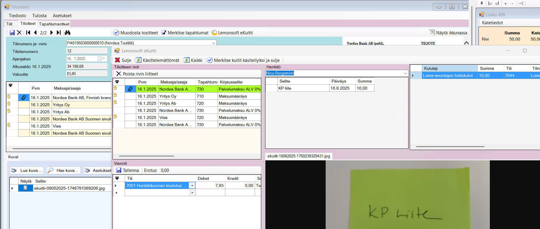Lemonsoftin eKuitti-toiminnolla saat helposti liitettyä kuitin tiliotteelle.