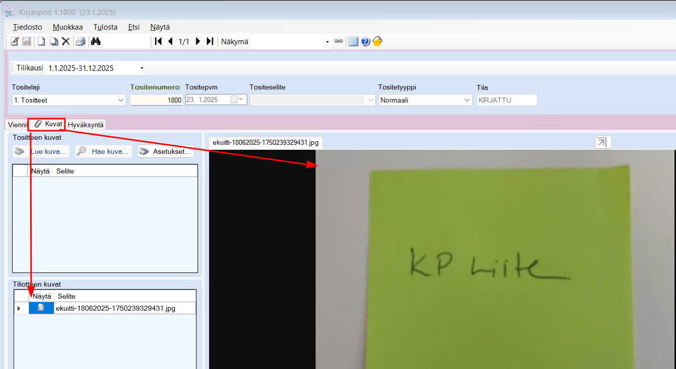 Liitteet siirtyvät automaattisesti myös kirjanpitoon, jolloin kuva näkyy kirjanpitosiitteen liitteenä.