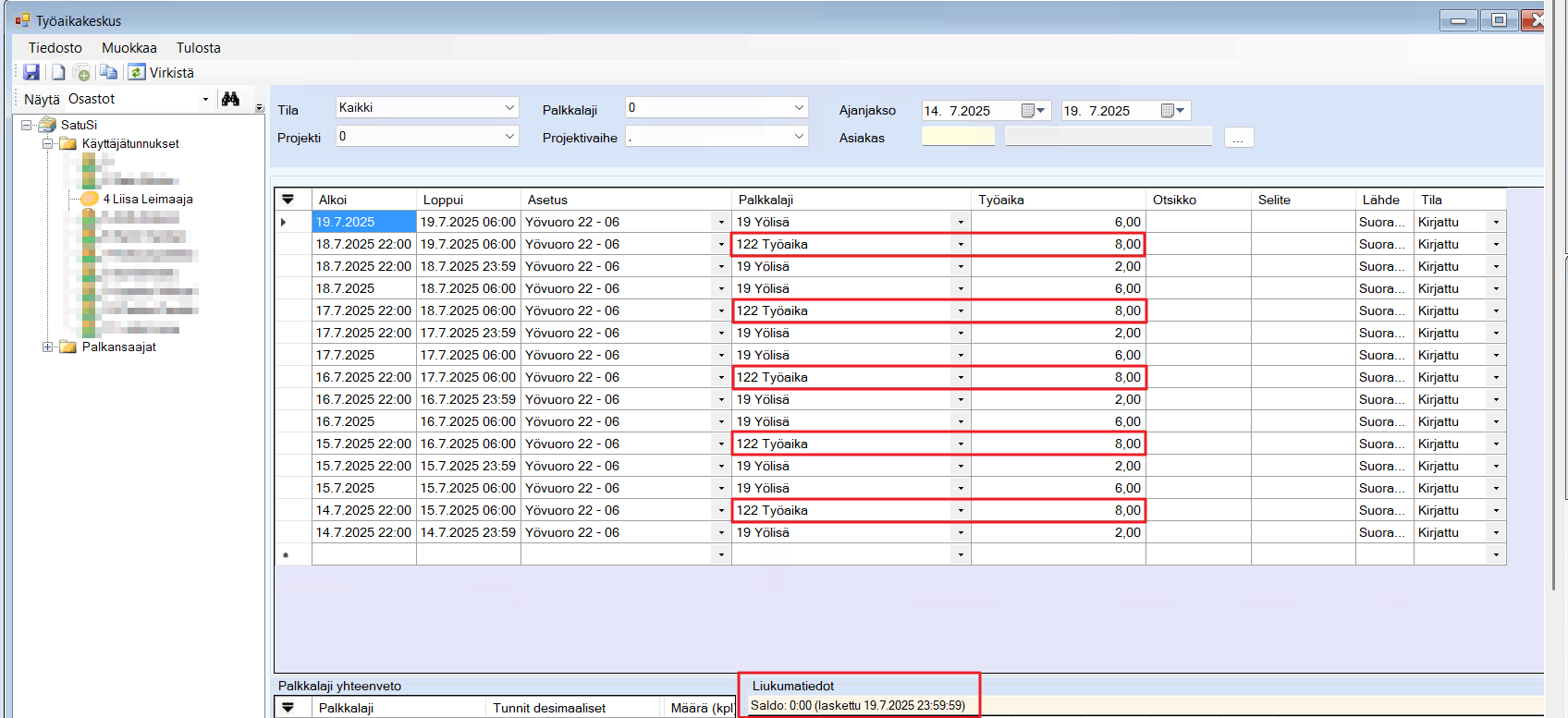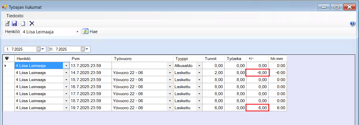 Liukumalaskenta tehdään vuorokausittain. Tämän vuoksi yövuoron ensimmäisenä päivänä liukumasaldoksi muodostuu negatiivinen tuntisaldo.
