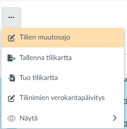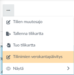 Tilikartta näytön vasemmasta ylänurkasta valitset ...-valikosta Tilinimien verokantapäivitys.