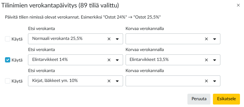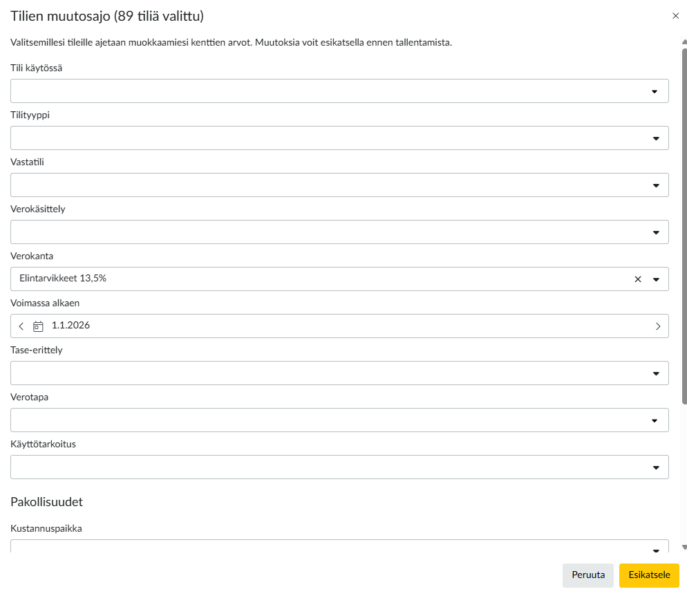 Toiminto esittää montako tiliä sinulla on valittuna, johon olet tekemässä muutosta. Valitse muutokset jotka haluat tehdä, eli syötä uusi Verokanta sekä Voimassa alkaen pvm ja valitse Esikatsele.