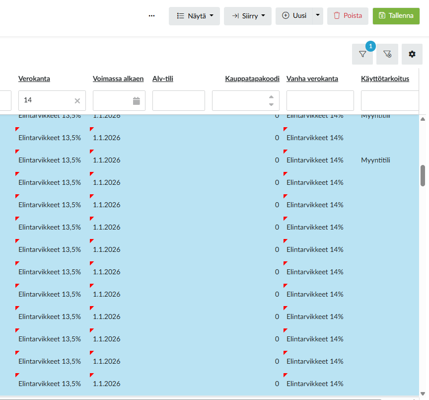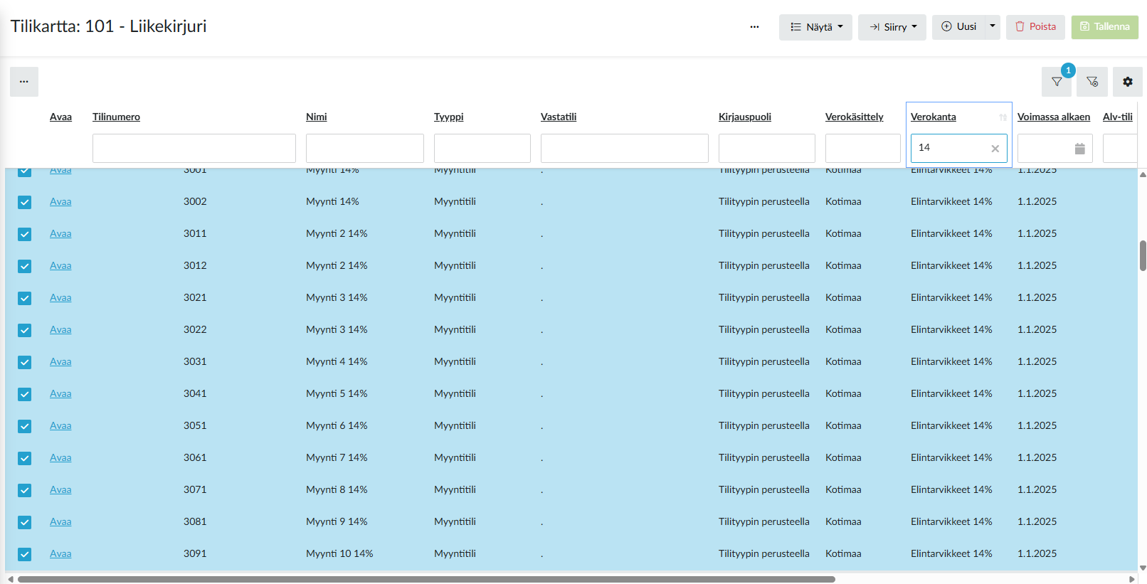 Suodata tilikarttaa Verokanta-sarakkeella, kun suodatat tilikarttaa ohjelma automaattisesti valitsee kaikki tilit jotka sopivat suodatukseen. Esim. jos suodatat Verokanta-sarakkeella, syötä siihen 14%.