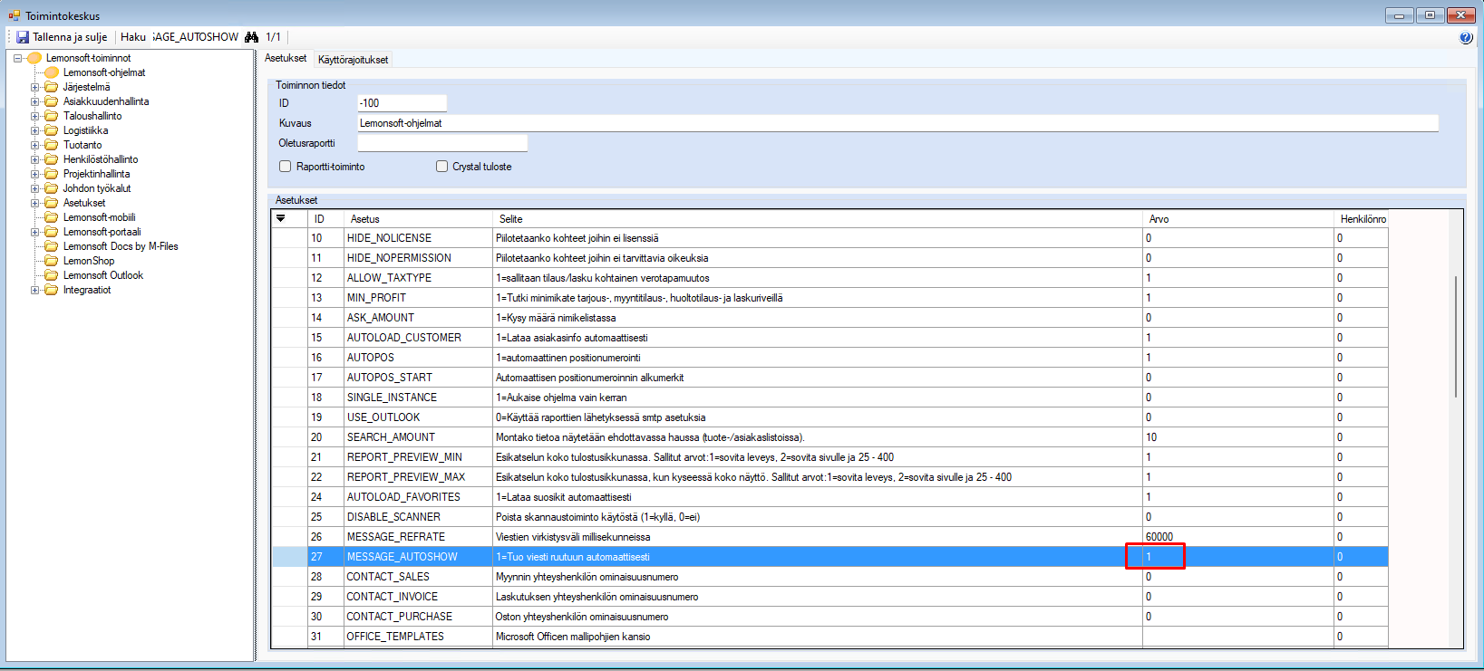 Kun käynnistät Lemonsoftin, ohjelma tutkii, onko sinulle tullut uusia viestejä tai CRM-tapahtumia. Jos viestejä tai tapahtumia on tullut, aukeaa halutessasi näytölle automaattisesti Työt-näyttö, josta näet sinulle osoitetut viestit ja tapahtumat. Jos haluat ohjelman käynnistyksen yhteydessä avata Työt-näytön, tulee toimintokeskuksen MESSAGE_AUTOSHOW-asetuksen arvo asettaa päälle (arvoksi 1)