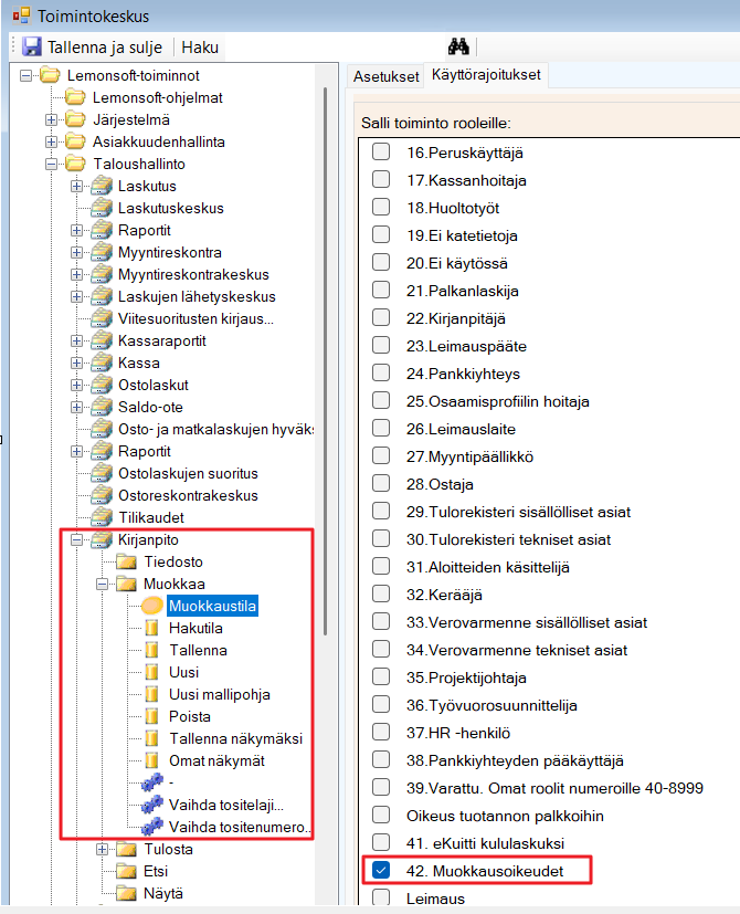 Mikäli halutaan rajoittaa tilintarkastajan muokkausoikeuksia, se tulee tehdä huolellisesti. Varsinaiselle kirjanpitäjälle annetaan perustettu Muokkausoikeudet -henkilörooli.