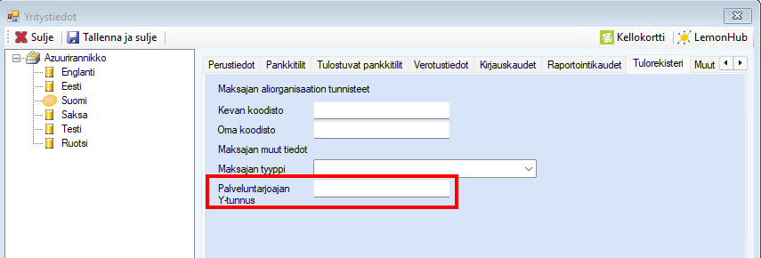 Mikäli aineiston muodostaja ja lähettäjä ovat eri kuin aineiston omistaja (eli esimerkiksi tilitoimisto tai muu yritys), merkitse kyseisen toimijan Y-tunnus (eli varmenneomistajan Y-tunnus) Palveluntarjoajan Y-tunnus -kenttään kohdassa Asetukset | Yritystiedot | Tulorekisteri. Eli käytännössä aina, kun muun yrityksen toimija toimittaa Tulorekisterin ilmoitukset yrityksen puolesta tilitoimiston tai muun yrityksen varmenteella, annetaan tämän yrityksen oma Y-tunnus tähän kenttään.