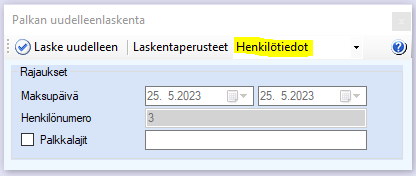 Korjaa tiedot oikeiksi Henkilörekisteriin ja tämän jälkeen laske palkka uudelleen Laske uudelleen -työkalulla. Työkalu löytyy Palkanlaskenta-ikkunan Muokkaa-valikosta -> Laske uudelleen. Valitse Laskentaperusteeksi Henkilötiedot.