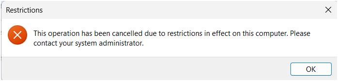 Tallentaessa tai haettaessa tiedostoja SAAS-ympäristössä antaa aina ko. ilmoituksen, koska käyttäjällä ei ole pääsyä palvelimen asemille. Ilmoitus saattaa tulla useampaankin kertaan, mutta siitä pääsee eteenpäin valitsemalla OK. Teksti voi näkyä joko englanniksi tai suomeksi: This operation has been cancelled due to restrictions in effect on this computer tai Tämä toiminto on peruutettu tässä tietokoneessa olevien rajoitusten vuoksi